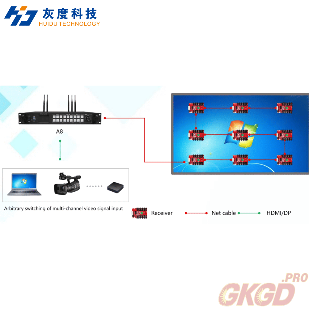 Box HD A8 hỗ trợ đồng bộ hóa hiển thị màn hình theo thời gian thực thông qua tín hiệu HDMI/DP. Người dùng có thể phát lại đồng bộ nhiều video và chuyển đổi tín hiệu đa kênh một cách linh hoạt.