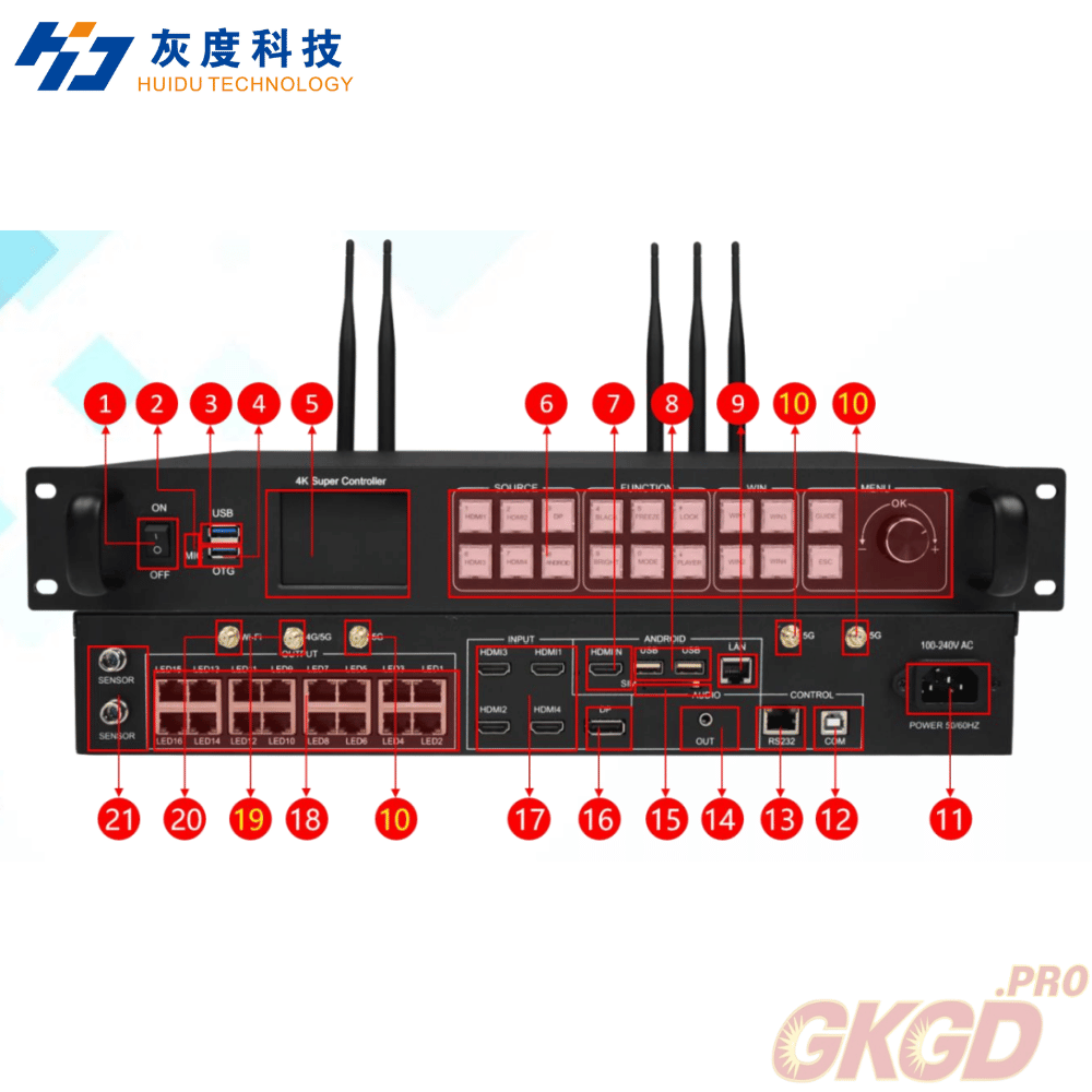 IN: AC 100~240V, USB3.0x1, USB2.0x2, OTGx1, RJ45x1, RS232x1, HDMIx5, DPx1, Cảm biếnx2, Âm thanhx1 OUT: RJ45x16, Âm thanhx1 |