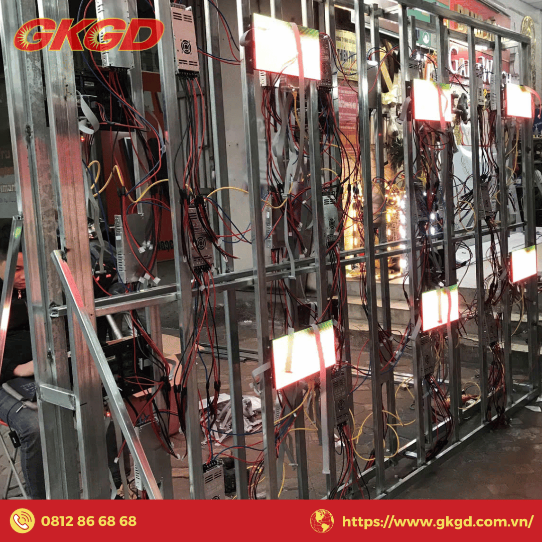 - Cố định màn hình lên khung: Lắp đặt các module LED theo bản thiết kế, kết nối module vào khung đỡ.